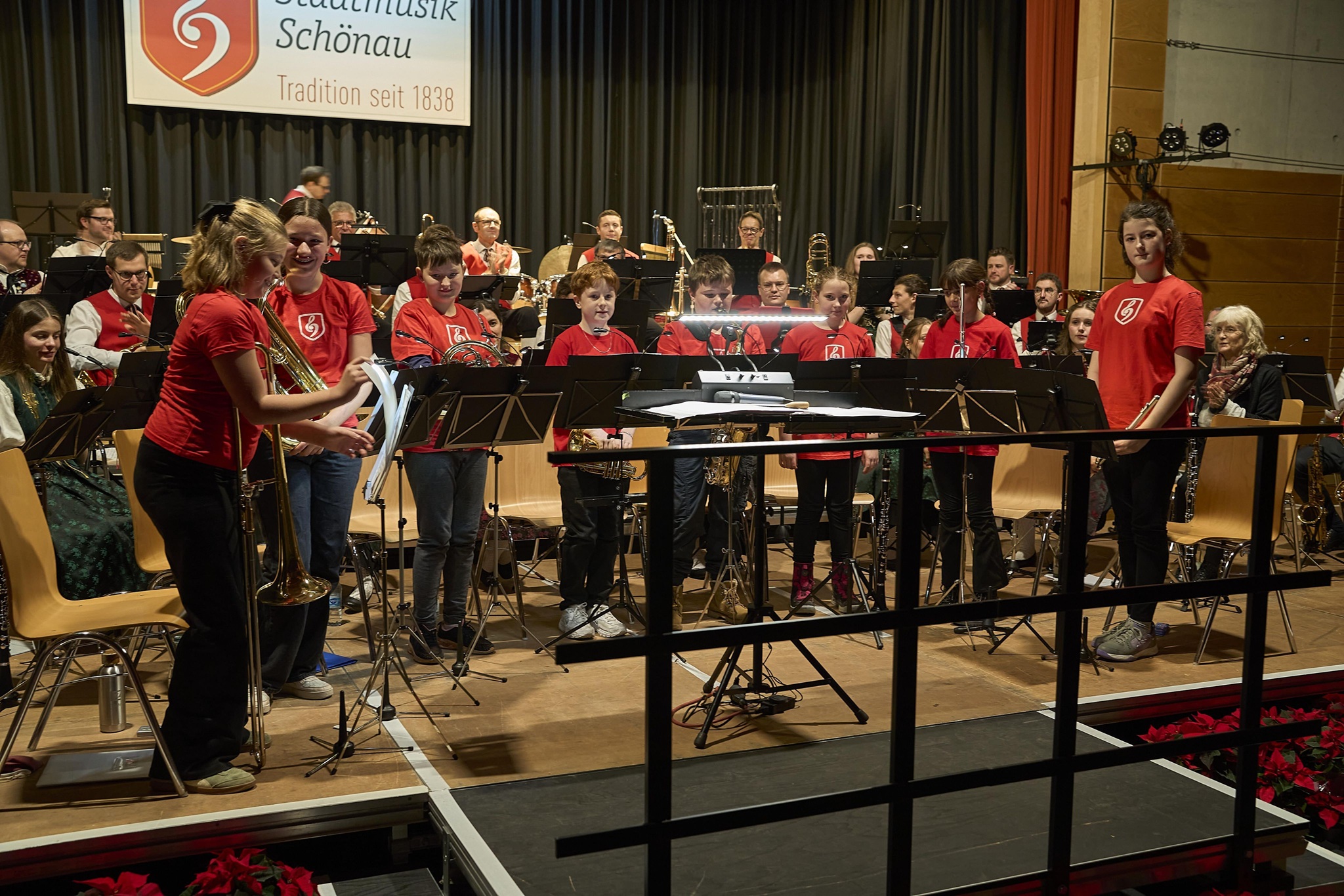 Nach diesem dynamischen „Star Wars" Arrangement, durfte die Stadtmusik etwas verschnaufen und die Jugendmusik auf der Bühne Platz nehmen. Seit Mai proben die liebevoll „Bambinis" genannten Jungmusikerinnen und -musiker nun gemeinsam und präsentierten ihren großen Fortschritt mit der Fanfare „When the Saints ..." und dem „Big Mac March". Ebenso groß fiel der Applaus des begeisterten Publikums aus, das mit der Zugabe „Morgen kommt der Weihnachtsmann" belohnt wurde.